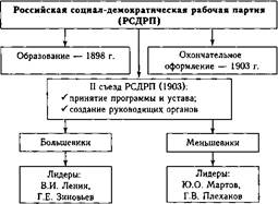 органы (схема 181). Программа партии была нацелена как на решение задач буржуазно-демократической революции (программа «минимум»): свержение самодержавия, установление демократической республики, 8-часового рабочего дня, ликвидация остатков крепостничества в деревне; так и на осуществление социалистической революции и установление диктатуры пролетариата (программа «максимум»). При обсуждении уставных и программных вопросов, а также при выборах руководящих органов РСДРП наметились расхождения, вылившиеся в раскол и образование двух течений: большевиков во главе с В.И. Лениным и меньшевиков во главе с Ю.О. Мартовым и Г.В. Плехановым (табл. 35).