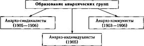 люционным путем. Идеальным общественным строем они называли федерацию самоуправляющихся общин и ассоциаций, где человеческая личность свободна от всех форм зависимости. Первые анархические группы в России и за рубежом появились в начале XX в., их организационная структура была весьма аморфна и неустойчива. Поэтому к 1905—1907 гг. в анархизме сложились три течения: анархо-комму- мизм, цель которого заключалась в построении после революции нового строя в форме анархического коммунизма (сторонники П. Кропоткина, группа «Хлеб и воля» и др.); анархо-синдикализм, провозглашавший основной целью своей деятельности полное освобождение труда от всех форм эксплуатации и власти, создание свободных профессиональных объединений трудящихся (Я.И. Кирилловский, В.А. Гюссе и др.); анархо-индивидуализм, пропагандировавший абсолютную свободу личности (представители гуманитарной интеллигенции — А.А. Боровой, И. Бродский, Г.И. Чулков и др.) (схема 183).
