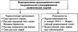— плавное реформирование политической системы России (замена самодержавия парламентской монархией по английскому образцу, создание ответственного перед Государственной думой правительства, введение всеобщего избирательного права и демократических свобод); — разрешение аграрного вопроса посредством искоренения полуфеодальных пережитков в деревне, частичная конфискация помещичьих земель и увеличение размеров крестьянских наделов; — признание за рабочими права на забастовки, государственное страхование, 8-часовой рабочий день. Кадеты объединили в своем составе представителей интеллектуальной российской элиты: преподавателей, юристов, философов, экономистов, журналистов (С.А. Муромцев, В.И. Вернадский, А.А. Корнилов, В.А. Маклаков, А.И. Шингарев, Д.И. Шаховской и др.), лидером партии был известный историк П.Н. Милюков. Другим крылом либерального направления были октябристы. Их организационное оформление началось после октябрьского царского манифеста 1905 г. Первый съезд «Союза 17 октября» (так официально называлась эта политическая партия) состоялся в феврале 1906 г. Партия представляла интересы торгово-промышленной буржуазии, крупных землевладельцев, а также части земских деятелей, несогласных с кадетскими позициями. Их программные требования были более умеренными и консервативными в рамках либеральной идеологии, чем у кадетов. Главной целью октябристы считали оказание помощи правительству, которое осуществляет необходимые и спасительные (по их мнению) для страны реформы. Они выступали за сохранение в России монархии, не принимали западный вариант парламентаризма, а будущий государственный строй видели в сочетании власти императора с властью парламента (правительство должно назначаться царем, но нести ответственность не только перед ним, но и перед представительным органом). В аграрном вопросе основным для них было увеличение асмельных крестьянских наделов за счет ресурсов государства и покупки земли через Крестьянский банк теми, кто мог ее приобрести. В пом плане их позиция была близка к П.А. Столыпину и его аграрным преобразованиям. На политической арене октябристы занимали место между кадетами и правыми монархистами. Среди членов «Союза 17 октября» было много весьма известных в России людей: промышленник и банкир И.П. Рябушинский, князь Н.С. Волконский, адвокат Ф.Н. Плевако, издатель Б.А. Суворин, ювелир К.Г. Фаберже, публицист А.А. Столыпин и др. Лидерами партии были А.И. Гучков и М.В. Родзянко. Другие либеральные партии — партия демократических реформ (лидеры К.К. Арсеньев, М.М. Ковалевский, В.Д. Кузьмин-Караваев) и партия мирного обновления (лидеры П.А. Гейден, Д.Н. Шипов) не были массовыми и влиятельными. Их члены впоследствии создадут прогрессивную партию, в которой объединятся представители промыш- ленно-торговых кругов (прежде всего московских — А.И. Коновалов и Н.П. Рябушинский) и интеллигенты-либералы (Д.Н. Шипов, П.А. Гейден, Н.Н. Львов, Е.Н. Трубецкой), несогласные с кадетско-октябрист- скими позициями. Опорой самодержавия в политической жизни России стало консервативно-традиционалистское течение, представленное в начале XX в. рядом организаций и партий (схема 185). Наиболее известными были черносотенцы. Термин «черная сотня» имел исторический контекст. На Руси в Средние века так называлось