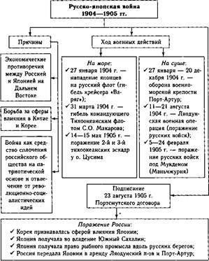 ическая оборона главного опорного пункта России в Южном Китае — Порт-Артура — продолжалась почти в течение всего 1904 г. Гарнизон выдержал шесть штурмов и сковал у крепости почти 200-тысячную японскую армию. Сопротивление было прекращено в декабре 1904 г. по приказу коменданта генерала A.M. Стесселя, хотя силы для обороны еще были. После падения Порт-Артура ухудшилось стратегическое положение русской армии в Маньчжурии, где продолжались боевые действия. Крупное сражение произошло с 6 по 25 февраля 1905 г. при Мукдене (центр южной Маньчжурии, родина маньчжурской династии Цин, правившей в Китае в 1644—1911 гг.). Русские войска упорно оборонялись, но были вынуждены отступить по приказу генерала А.Н. Куро- паткина. Мукденская битва была последним крупным военным столкновением на суше в Русско-японской войне 1904—1905 гг. Для помощи Тихоокеанскому флоту были сформированы на Балтике 2-я и 3-я тихоокеанские эскадры, которые в октябре 1904 г. под командованием вице-адмирала З.П. Рожественского были отправлены на Дальний Восток. Совершив долгое семимесячное плавание, 14—15 мая 1905 г. они в Корейском проливе у Цусимских островов приняли бой против превосходящего японского флота (120 японских кораблей против 30 русских). В итоге русский флот был разгромлен, погибли более 5 тыс. моряков и лишь четырем кораблям удалось добраться до Владивостока. Летом 1905 г. японцы беспрепятственно овладели о. Сахалин. Но, несмотря на победы, силы Японии были серьезно подорваны войной, и при посредничестве США в г. Портсмут начались переговоры о мире. Российскую делегацию возглавлял С.Ю. Витте, а японскую — министр иностранных дел Ю. Комура. 23 августа 1905 г. между Россией и Японией был подписан мирный договор, констатировавший поражение России в войне. Япония присоединила к своей территории южную часть о. Сахалин, получила право на аренду Ляодунского полуострова и Порт-Артура. Россия признала сферу влияния Японии в Корее. Вместе с тем в ходе переговоров японцам не удалось добиться от российской стороны выплаты контрибуции, полной уступки о. Сахалин, выдачи русских кораблей, укрывшихся в нейтральных портах, и ограничения количественной численности российского военно-морского флота на Дальнем Востоке. Безвозвратные потери России в этой войне составили 52 500 убитыми, санитарные — 564 500 человек (раненные и заболевшие). Японцы потеряли 80 тыс. убитыми, а санитарные потери составили около 120 тыс. Основными причинами поражения в войне были общая неподготовленность России к военным действиям на Дальнем Востоке, слабость транспортного обеспечения армии в данном регионе и, безусловно, бездарность высшего военного руководства. Впоследствии С.Ю. Витте в своих воспоминаниях напишет: «... не Россию разбили японцы, а наши порядки или, правильнее, наше мальчишеское управление 140-миллионным населением в последние годы». 14.4. Революция 1905—1907 гг. Первая русская революция 1905—1907 гг. произошла в результате общенационального кризиса, который приобрел масштабный, глубокий и острый характер (схема 187). Чрезвычайно высокими оказались социальные издержки капиталистической индустриализации при сохранении старых феодальных укладов в сельском хозяйстве, в котором было занято большинство населения страны. Россия в этот период была практически единственным государством в Европе, где отсутствовали парламент, л