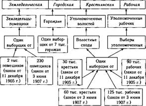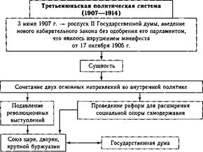 перераспределялись в пользу политических сил, лояльных к монархии. [Ого было определенным правовым нарушением манифеста 17 октября 1!Ю5 г. и основных законов Российской империи, поэтому революционный лагерь определил данное изменение как государственный переворот, что означало окончательное поражение революции 1905—1907 гг. М стране начала действовать так называемая третьеиюньская государственная система (схемы 191 —193).