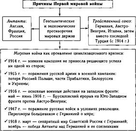 • административные — сопротивление части государственного аппарата; • социально-политические — борьба политических сил, как правых, так и левых, увидевших в реформах П.А. Столыпина угрозу своему влиянию; • личные — сложные отношения с Николаем II и его ближайшим окружением. В условиях острой политической борьбы осуществлялась работа российского парламента — Государственной думы, основные вехи деятельности которой приведены в табл. 36. Реформы, проведенные в стране под воздействием революции 1905— 1907 гг., как это почти всегда бывало в истории России, оказались запоздалыми и были возможны только в тех рамках, на которые соглашалось самодержавие или на которые вынуждал народ. В связи с этим в общественном сознании стало формироваться представление о том, что революционное давление на власть становится предпочтительным средством политической борьбы в России. И события 1917 г. это подтвердили. 14.6. Россия в Первой мировой войне (1914-1918) Первая мировая война была вызвана острыми экономическими и геополитическими противоречиями между главными мировыми державами. Эти противоречия обусловливались столкновением интересов Англии, Франции, Германии, России, Австро-Венгрии и других стран (схема 195). Особую активность в международных отношениях проявляла Германия, стремившаяся к мировому господству и силовому переделу мира. Такая линия поведения привела к враждебным отношениям между Германией и Англией (преимущественно из-за колоний), а также Францией (из-за Эльзаса и Лотарингии, захваченных немцами в результате франко-прусской войны 1870—1871 г., и Марокко, которое обе страны пытались превратить в колонию). И у России существовали серьезные противоречия с Германией (прежде всего торгово-экономические, а также геополитические, связанные с вопросом о контроле над проливами и влиянием в Турции) и Австро-Венгрией (из-за господства на Балканах). Россия после поражения в войне с Японией не могла решать самостоятельно масштабные международные задачи, проводила осторожную политику, но не оставляла своих традиционных внешнеполитиче-