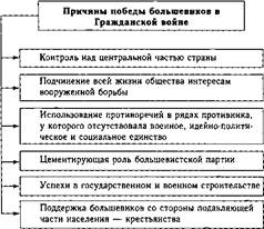 раза по сравнению с довоенной. Тяжелое положение было на транспорте: 31 железная дорога не работала, эшелоны с хлебом застревали в пути. Из-за отсутствия сырья, топлива и рабочей силы большинство фабрик и заводов бездействовало. Только в Москве было закрыто более 400 предприятий. Валовая продукция сельского хозяйства в 1921 г. составляла 60% уровня 1913 г. Уменьшились поголовье скота и продукция животноводства. Посевные площади сократились на 25% в 1920 г., а урожайность — на 43% (по отношению к 1913 г.). Неурожай в 1920 г., засуха в 1921 г., голод в Поволжье, на Северном Кавказе, в части Украины унесли из жизни около 5 млн человек. 15.5.4. Итоги и последствия победы большевиков в Гражданской войне Гражданская война, завершившаяся победой большевиков, стала драматическим испытанием для страны, для победителей и побежденных. Историки выделяют целый комплекс причин, которые способствовали победе Советской власти (схема 212). Главный ее фактор — поддержка большевиков со стороны подавляющей части населения — крестьянства, получившего по Декрету о земле удовлетворение своих