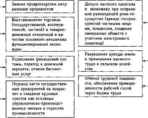 лью укрепления обобществленных государственных форм в экономике и подразумевало расширение плановых начал (образование Госплана), усиление государственного контроля и регулирования (деятельность Рабкрина, открытие Госбанка, начало стабилизации валюты), концентрацию производства, расширение распределительных отношений (между ведущими отраслями, крупнейшими предприятиями). Для развития этого направления использовались вся мощь государственных институтов и идеологическое обеспечение в рамках концепции построения социализма. Второе направление реформ — активизация рыночных, частнокапиталистических отношений. Для этого формировался блок новых по сравнению с военным коммунизмом отношений, создававших иллюзию глубокого коренного пересмотра концепции переходного периода от капитализма к социализму. Для развития этого направления осуществлялся комплекс мер, способствующих функционированию товарно-денежных отношений: переход от продразверстки к продналогу, разрешение свободной торговли и частной промышленности, сдача госпредприятий в аренду, концессии, предоставление крестьянству свободы в использовании земли, инвентаря, рабочих рук. Перспективы данного направления реформ были ограничены по объему (главным образом в сфере мелкотоварного производства), времени (надолго, но не навсегда), потенциалу роста (без угрозы интересам политического господства диктатуры пролетариата). Рассмотрим конкретную практику нэповских реформ. Первым шагом перехода к нэпу стали решения X съезда РКП(б) (март 1921 г.), на котором обсуждался вопрос «О замене разверстки натуральным налогом». На седьмой день работы съезда с основным докладом о замене разверстки налогом выступил В.И. Ленин, а с содокладом — А.Д. Цюрупа. Перед В.И. Лениным стояла нелегкая задача убедить съезд, партию в целом в необходимости принятия нового метода возрождения сельского хозяйства. Но у него были веские аргументы: антибольшевистские крестьянские восстания, охватывавшие все новые и новые губернии, спад мировой революции, Кронштадтский мятеж. В этой обстановке В.И. Ленин сделал два основополагающих вывода: во-первых, «только соглашение с крестьянством может спасти социалистическую революцию в России, пока не наступила революция в других странах»; во-вторых, «мы не должны стараться прятать что-либо, а должны говорить прямиком, что крестьянство формой отношений, которая у нас с ним установилась, недовольно, что оно этой формы отношений не хочет, и дальше так существовать не будет». На X съезде было принято ленинское предложение о замене разверстки натуральным налогом. Продналог вводился на 13 видов продовольствия, технических и фуражных культур. Все, что оставалось у крестьян после сдачи налога, полностью поступало в их распоряжение. Так, на 1921 г. Совнарком установил продналог в количестве 240 млн пудов (вместо 423 млн пудов по разверстке 1920 г.), т.е. почти в два раза меньше разверстки, причем основная его часть взималась с зажиточного крестьянства. Наиболее бедные крестьяне, являвшиеся опорой власти в деревне, и коллективные хозяйства от налога освобождались или получали существенные льготы. Размеры продналога крестьянину сообщались заранее, т.е накануне посевной, поэтому крестьянин мог расширить посевную площадь, получить больше продовольственных излишков и за