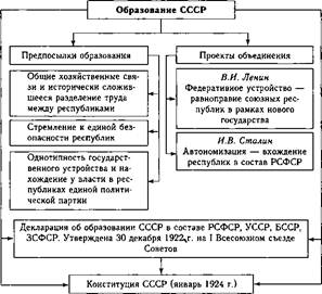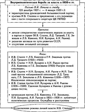 В августе 1922 г. Политбюро ЦК РКП(б) создало комиссию для рассмотрения вопроса о взаимоотношениях РСФСР и других советских республик во главе с В.В. Куйбышевым. Решающую роль в ней играл И.В. Сталин, который был тогда наркомом по делам национальностей, а с апреля 1922 г. — Генеральным секретарем ЦК РКП(б). Он разработал проект резолюции комиссии «О взаимоотношениях РСФСР с независимыми республиками», в котором предусматривалось вступление Украинской, Белорусской и Закавказских республик в РСФСР на правах автономных, а с Бухарой, Хорезмом и Дальневосточной республикой предполагалось сохранить уже существовавшие договорные отношения. Проект И.В. Сталина получил неоднозначную оценку в партийно- государственных кругах. Осенью 1922 г. эти материалы были направлены В.И. Ленину, который предложил вместо сталинского плана ав- тономизации новую форму государственного объединения — образование нового союзного государства как федерации равноправных республик. В октябре 1922 г. ленинский план был обсужден и одобрен на всех уровнях республиканского руководства, а также съездах Советов. 30 декабря 1922 г. I Всесоюзный съезд Советов декларировал образование Союза Советских Социалистических Республик (СССР) и определил систему и компетенцию союзных органов власти. 31 января 1924 г. II Всесоюзный съезд Советов СССР утвердил первую Конституцию СССР (схема 214). 16.3. Внутриполитическая борьба за власть и установление режима личной власти И.В. Сталина Борьба за власть среди лидеров большевистской партии началась еще в последние годы жизни В.И. Ленина (схема 215). Ввиду болезни с конца 1922 г. он фактически отошел от руководства партией и страной, но сумел продиктовать ряд писем и статей, которые впоследствии историки назовут ленинским политическим завещанием. Ключевым стало «Письмо к съезду», где он предостерегал большевиков от возможного раскола, фракционной борьбы, бюрократизации и дал характеристики наиболее значимым деятелям партии: И.В. Сталину, Л.Д. Троцкому, Г.Е.Зиновьеву, Л.Б.Каменеву, Н.И. Бухарину и Г.Л. Пятакову. По мнению В.И. Ленина, главная опасность заключалась во взаимоотношениях Л.Д. Троцкого и В.И. Сталина, что могло привести к расколу. И.В. Сталина, который сосредоточил в своих руках огромную власть, он оценил весьма нелицеприятно, отметив его грубость, капризность, нетерпимость к критике, и предложил переместить с поста генерального секретаря ЦК РКП(б).