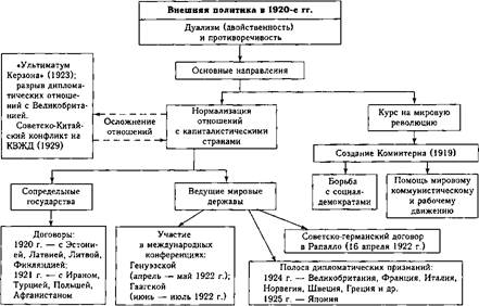 После смерти В.И. Ленина «Письмо к съезду» было доложено делегатам XIII съезда РКП(б) (май 1924 г.), но И.В. Сталину удалось сохранить за собой высший партийный пост. Еще при жизни В.И. Ленина в партии существовали различные фракции. X съезд РКП(б), состоявшийся в марте 1921 г., официально запретил их, но неформально фракционность сохранялась и была представлена в Политбюро ЦК большевистской партии. Историки отмечают четыре фракционные группы: — И.В. Сталина, опиравшегося на партийный аппарат; — Л.Д. Троцкого, возглавлявшего фракцию «левых коммунистов» (К.Б. Радек, Г.Л. Пятаков, Л.П. Серебряков, Н.Н. Крестинский, А.А. Иоффе, Х.Г. Раковский и др.); — Г.Е. Зиновьева и Л.Б. Каменева, имевших прочные позиции в ленинградской партийной организации; — Н.И. Бухарина, А.И. Рыкова, М.П. Томского, «умеренных» членов Политбюро, обвиненных впоследствии в «правом уклоне» в партии. Внутриполитическая борьба этих групп была обусловлена как личными амбициями лидеров, так и разногласиями по проблемам партийно-политических и экономических отношений в стране и мире. И.В. Сталин в 1923—1924 гг. образовал вместе с Г.Е. Зиновьевым и Л.Б. Каменевым неофициальную руководящую тройку. Одновременно он старался наладить контакт с группой Н.И. Бухарина. Вместе с этими союзниками он выступил против Л.Д. Троцкого, который претендовал на роль преемника В.И. Ленина. В результате Л.Д. Троцкого обвинили в стремлении стать диктатором, и в январе 1925 г. он был снят с постов наркома по военным и морским делам и председателя Реввоенсовета, что стало началом конца его политической карьеры. Осенью 1925 г. триумвират Сталин — Зиновьев — Каменев распался. Страх перед возрастающей политической силой И.В. Сталина привел к созданию Г.Е. Зиновьевым и Л.Б. Каменевым «новой оппозиции», которая потерпела поражение в декабре 1925 г. на XIV съезде ВКП(б). В 1926 г. Л.Б. Троцкий, Г.Е. Зиновьев и Л.Б. Каменев сблокировались для новой борьбы с И.В. Сталиным, но это было сделано с большим опозданием, так как позиции И.В. Сталина и его сторонников стали весьма сильны, и так называемая «объединенная оппозиция» в конце 1927 г. потерпела поражение. Все видные представители этого блока были исключены из партии. Л.Д. Троцкого в 1928 г. сослали в Алма-Ату, а в 1929 г. депортировали из СССР. В 1940 г. он был убит в Мексике агентом советских спецслужб. И наконец, в 1928—1930 гг. наступила очередь группы Н.И. Бухарина, А.И. Рыкова и М.П. Томского, которые ранее активно помогали И.В. Сталину в борьбе против других оппозиционеров. В период слома нэпа и начала форсированной реконструкции советского общества они высказывали иные, чем сталинские, точки зрения на политику партии в деревне, по вопросам о темпах и методах социалистического строительства. Их обвинили в «правом уклоне» и удалили с руководящих постов. В итоге в стране установился режим личной власти И.В. Сталина, превратившийся вскоре в культ личности. 16.4. Внешняя политика Внешняя политика Советского государства в 1920-е гг. была направлена на реализацию двух взаимоисключающих задач, что определяло ее дуализм (двойственность) и противоречивость (схема 216). С одной стороны, большевики продолжали верить в мировую революцию, помогали мировому коммунистическому и рабочему движению и специально создали для этих целей в 1919 г. III Интернационал (Коминтерн). С другой стороны, ставка на скорую мировую революцию не о