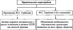 стремлением геронтократов продлить свою власть. Вновь стали возрождаться худшие брежневские традиции. Началась идеологическая кампания по совершенствованию развитого социализма, была свернута борьба с коррупцией и за дисциплину. Стали ухудшаться экономические показатели, обозначив кризисность ситуации. 10 марта 1985 г. К.У. Черненко скончался. Контрольные вопросы 1. С какими проблемами столкнулось новое советское руководство после отставки Н.С. Хрущева? 2. Каковы суть экономической реформы 1965 г. и ее основные направления? * 3. С чем связано нарастание кризисных явлений во всех сферах общества? 4. Что такое «доктрина Брежнева» в области внешней политики? 5. Почему сельское хозяйство находилось в перманентном кризисе? 6. Какие главные тенденции были характерны для культуры 1960-х — первой половины 1980-х гг.? Литература Адриянов В.И. Косыгин. М., 2003. Алексеева Л. История инакомыслия в СССР. М., 1992. Л.И. Брежнев. Материалы к биографии. М., 1991. Волкогонов Д.А. Семь вождей. Галерея лидеров СССР. М., 1995. Кн. 2. Кушнерева Ю., Черникова Т. 1960-е годы: иллюзии и разочарования. Мир и СССР в 60-е годы. М„ 1998. Марчук Н.И. «Необъявленная» война в Афганистане: официальная версия и уроки правды. М., 1993. Медведев Р.А. Личность и эпоха. Политический портрет Л.И. Брежнева. М., 1991. Кн. 1—2. Медведев Р.А. Генсек с Лубянки. М., 1993. На пороге кризиса: нарастание застойных явлений в партии и обществе. М., 1990. Синявский А.С. Российский город в 1960—1980-е гг. М., 1995. Уроки реформы 1965 г. М., 1992. Семанов С. Юрий Андропов. М., 2003. Эпелинг В. Политика и культура при Хрущеве и Брежневе. 1953—1970 гг. М„ 1999. 22. СОВЕТСКИЙ СОЮЗ В 1985-1991 ГОДАХ. ПЕРЕСТРОЙКА 22.1. Цели, предпосылки и этапы перестройки В марте 1985 г. на фоне всеобщего стремления страны к обновлению в результате закулисной борьбы к власти пришло новое политическое руководство во главе с М.С. Горбачевым. Располагая всеобъемлющей информацией, тщательно скрываемой от общества, и понимая, что в стране наступает тяжелейший кризис, Политбюро ЦК КПСС по инициативе М.С. Горбачева решает приступить к реформированию общества, которое в дальнейшем получит название «перестройка» (схема 259). Этот период станет одним из самых драматических в новейшей отечественной истории. Первоначально считалось, что реформирование СССР должно идти по пути совершенствования принципов социализма, очищения его от сталинских деформаций, использования ленинских подходов при решении сложных социально-экономических и политических проблем.