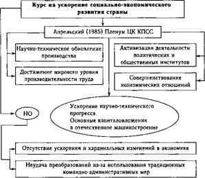 Были надежды на то, что удастся заставить работать эту систему, придав ей второе дыхание. Уже на закате перестройки, в феврале 1991 г., М.С. Горбачев так объяснял причины ее начала: «Только на первый взгляд может казаться, что все было тогда нормально. Уже в конце 1970-х — начале 1980-х гг. стало ясно, что так дальше вести дела нельзя. Прирост производительности труда уменьшился в два раза, а потом дошел до нуля. На единицу национального дохода мы расходовали по сравнению с развитыми странами электроэнергии, топлива, металла в полтора-два раза больше. Пока были неисчерпаемы ресурсы, хорошая конъюнктура на нефть, неисчерпаемые трудовые ресурсы — выкручивались за счет этого. Потом трудовых ресурсов стало не хватать, что же касается природных — за ними пришлось идти в необжитые районы, производя огромные затраты. Как говорится, беззаботная жизнь кончилась... Добавлю и другие причины. Наша экономика перегружена отраслями тяжелой промышленности, слишком мало предприятий производят товары народного потребления. Это была самая милитаризованная экономика в мире и самые огромные затраты на оборону. Если еще вспомнить, что происходило в политическом процессе, — никто не мог и слова правдивого сказать: надо что-то делать на предприятии, в регионе, республике. Никого не интересовало мнение рабочего класса, крестьянства, интеллигенции». Иными словами, перестройка была вызвана объективной необходимостью, которая обусловливалась кризисными явлениями во всех сферах жизни общества. Основные этапы перестройки приведены в табл. 49. 22.2. Попытки экономических преобразований У М.С. Горбачева, когда он начал преобразования, по всей видимости, не было целостной и развернутой программы реформ, поэтому первоначально для достижения быстрого улучшения состояния дел в народном хозяйстве использовались подходы, традиционные для советской административно-командной системы. Первым практическим шагом на пу-ци к реформированию стали решения, принятые на апрельском (1985) Пленуме ЦК КПСС, в которых провозглашался курс на ускорение социально-экономического развития страны (схема 260). Это предусматривало научно-техническое обновление производства и достижение мирового уровня производительности труда, совершенствование экономических отношений, акти-