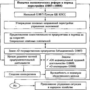 ческой структурой, что привело к увеличению административного персонала и практически не отразилось на качестве товаров. В мае 1985 г. в стране началась антиалкогольная кампания, основанная на широком комплексе административно-запретительных мер. Резко сократилось производство винно-водочных изделий, вырубались многие гектары виноградников на юге страны. В результате существенно сократились поступления в госбюджет. Социальные и экономические издержки такой инициативы самым негативным образом повлияли на ход перестройки. К серьезным последствиям для страны привела авария на Чернобыльской АЭС, произошедшая 26 апреля 1986 г.: погибли люди, радиоактивное облучение получили десятки тысяч человек, заражению подверглись большие территории Украины, Белоруссии и РСФСР. Вскоре стало очевидно, что никакого ускорения не получилось и кардинальных изменений в экономике не произошло. Поэтому руководство страны, чтобы оживить экономику, стало искать новые пути: предоставлять самостоятельность предприятиям, сокращать плановые показатели, расширять сферу деятельности негосударственного сектора. Июньский (1987) Пленум ЦК КПССС утвердил основные направления перестройки управления экономикой. Вскоре на сессии Верховного Совета СССР был принят Закон о государственном предприятии (объединении), который вступал в силу с 1 января 1988 г., а Совет Министров утвердил постановление о перестройке планирования, ценообразования, финансов (схема 261). К мерам, которые выдавались за радикальную экономическую реформу, относились следующие: