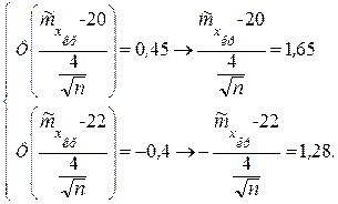 если критерий двусторонний – a делится на две области. По величине a устанавливаем границу хкр . 4 Правило принятия решения. Если опытное значение критерия оказалось в критической области, то есть в a, гипотеза Н0 – отвергается. Если статистика попала в область, определенную 1 – a то, следовательно, делается вывод – опытные данные не противоречат гипотезе Н0. 5 Проверка уровня мощности критерия 1 – b. По 1 – b находится риск заказчика b, и только проанализировав его, принимается решение провести дополнительные исследования или принять гипотезу. Пример № 4. Стреляют три гаубицы по три выстрела каждая. Обнаружено отклонение центра группирования от табличного. Ошибка дальномера при определении дальности s 2 = 16 м, mx = 20 м – табличное значение, mx1 = 22 м – опытное значение. Необходимо принять решение, что математическое ожидание mx = 20 м, а mx1 = 22 м – это следствие ограниченной выборки. Выдвигаем гипотезы
