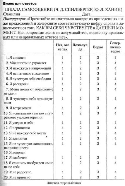 где 2, — сумма зачеркнутых цифр на бланке по пунктам шкалы 22,23, 24, 25, 28, 29, 31, 32, 34, 35, 37, 38, 40; Е2 - сумма остальных цифр по пунктам 21, 26, 27,30,33, 36, 39. Интерпретация полученных данных. При интерпретации результат тестирования можно оценивать так: до 30 — низкая тревожность; 31-45 — умеренная тревожность; 46 баллов и более — высокая тревожность.