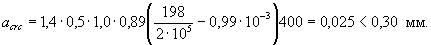 Ширина раскрытия трещин по (7.1) при φ1 = 1,4, φ2 = 0,5, φ3 = 1,0 и ψs = 0,78 равна