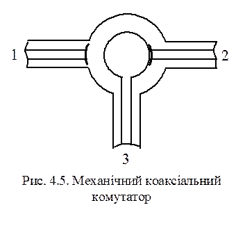 Приклад конструкції механічного перемикача жорстких коаксіальних ліній наведена на рис. 4.5. У центрі корпусу виконано сферичний контакт, з’єднаний з центральним провідником 3. Центральні провідники ліній 1 та 2 закінчуються пружними контактами із сферичними поверхнями і переміщуються вліво або вправо, поєднуючи лінію 3 з лінією 1 або 2 відповідно. На рис. 4.5 наведено положення розімкнених 1 та 3 ліній, поєднаних 2 та 3 ліній. В імпульсних РЛС з однією антеною для випромінення і приймання сигналів застосовуються антенні комутатори (перемикачі).