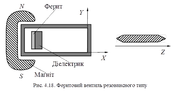 Феритові вентилі - це пристрої, які забезпечують проходження електромагнітних хвиль в одному напрямку і не пропускають їх в протилежному. При вмиканні їх між генератором та навантаженням енергія, що відбивається від навантаження, не проходить через вентиль і поглинається в ньому, що забезпечує незалежність режиму генератора від величини та характеру навантаження, тобто розв’язує їх. Залежно від характеру явищ у підмагнічених феритах на НВЧ, вентилі поділяються на декілька типів, серед яких будуть розглянуті ті, що набули найбільшого розповсюдження. 1. Резонансні вентилі. Принцип дії подібних вентилів полягає у тому, що за допомогою зовнішньої магнітної системи у феритовій пластині, що розміщена у хвилеводі, утворюється постійне магнітне поле, яке відповідає поперечному феромагнітному резонансу. При цьому, коефіцієнт згасання падаючої хвилі малий, а коефіцієнт згасання відбитої хвилі - великий. На рис. 4.18 наведений поперечний перетин вентиля на прямокутному хвилеводі з розміщеною всередині феритовою пластиною. Під час проходження через вентиль падаючої хвилі по хвилеводу на ферит діє вектор Існує два варіанти розміщення феритових пластин в резонансних вентилях (рис. 4.19, а, б). При розміщенні феритової пластини у площині Е (рис.4.19, а) вимагається менш сильне магнітне поле, ніж при її розміщенні у площині Н, яке використовується у вентилях підвищеної потужності, оскільки тут забезпечується краще тепловідведення та зменшена небезпечність електричного пробою. Поле підмагнічування, яке забезпечує феромагнітний резонанс та необхідне положення феритової пластини залежить від частоти, що обмежує робочу смугу частот вентиля. Розширити робочу смугу частот резонансного вентиля вдається шляхом використання діелектричної пластини, яка скріплюється із зразком фериту. Діелектрик сприяє збереженню у смузі частот умов обертання вектора