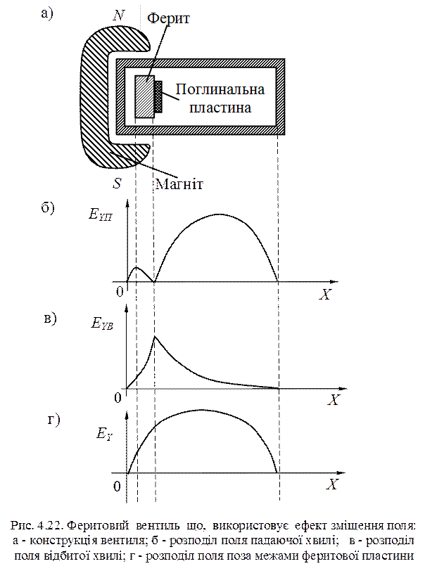 На вузькому провіднику є ряд шлейфів, що утворюють гребінчасту структуру. Розміщена на даній ділянці поперечно намагнічена феритова пластина утворює різні умови для розповсюдження падаючої та відбитої хвиль: послаблення однієї є незначним, а іншої − великим. Отже утворюється вентиль. Загальними недоліками вентилів з резонансним поглинанням є: велика вага постійного магніту; вона потребують великого значення величини вузькосмуговість; невелика припустима потужність. 2. Вентилі зі зміщенням поля. Вони, конструктивно, являють собою відрізок прямокутного хвилеводу, в якому розміщена феритова пластина, яка покрита з однієї сторони поглинальним шаром. Хвилевід розміщується у постійному магніті, який утворює постійне магнітне поле (рис. 4.22, а).