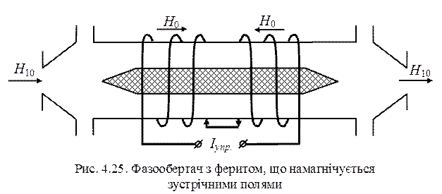 На осі круглого хвилеводу (1) з хвилею Н 11 закріплене за допомогою діелектричних втулок феритове осердя (2), що загострене з обох кінців для зменшення відбиття. Навкіл фериту розташована котушка зі струмом, який підмагнічує ферит у поздовжньому напрямку. В основу роботи фазообертача покладена залежність фазової постійної поляризованої по колу хвилі від величини зовнішнього поля, що підмагнічує ферит. Зміна фази відбувається шляхом зміни струму в котушці. Зазвичай хвилеводний тракт складається із прямокутних хвилеводів. Тому для переходу до круглого хвилеводу і перетворення поляризації хвилі з лінійної у колову в фазообертачі є плавні переходи (3), які перетворюють хвилю Н 10 у хвилю Н 11, та перетворювачі поляризації (4) у вигляді чвертьхвильових діелектричних пластин. Отримане, при цьому, поле з круговою поляризацією у секції з феритовим осердям зсувається за фазою пропорційно прикладеному магнітному полю. Друга чвертьхвильова пластина відновлює лінійну поляризацію хвилі. Схема аналогічного фазообертача, але без повороту площини поляризації хвилі наведена на рис. 4.25.