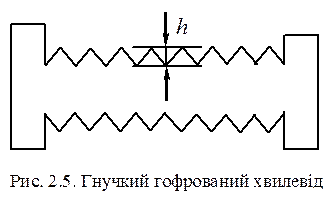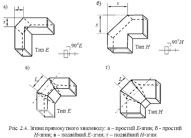 Поворотні секції у хвилеводах служать для зміни напрямку хвилеводного тракту. Конструктивно ці секції являють собою відрізки хвилеводів з фланцями на кінцях. Хвилеводні повороти та згини наведені на рис. 2.4. Вони являють собою нерегулярності. При вказаних розмірах та формах будуть мінімальні відбиття. У прямокутному хвилеводі з хвилею Хвилеводна скрутка служить для розвороту хвилеводу навколо осі. КСХ при використанні скрутки дорівнює − К с=1,1. Для поворотів хвилеводу можна також використовувати гнучкий гофрований хвилевід (рис. 2.5). Для того, щоб відбиття були незначні, висота ребер Згини мікросмужкових ліній наведені на рис. 2.6. Для зменшення відбиття розміри згинів повинні задовольняти умовам: для кутового згину (рис. 2.6, а)