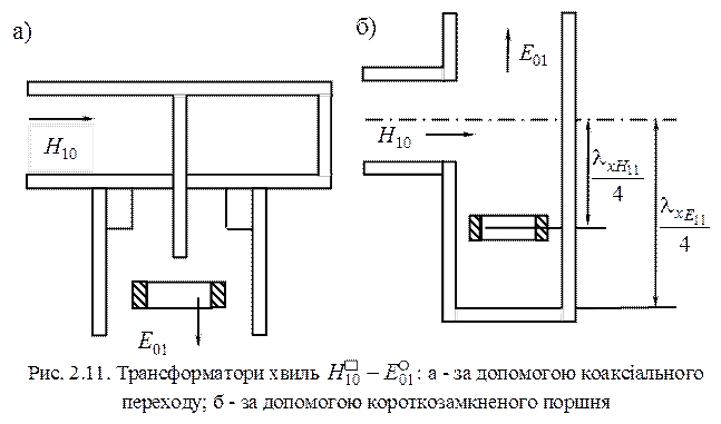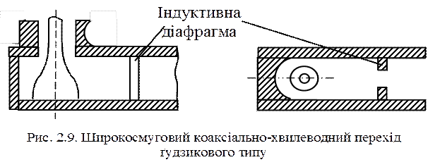 Для широкосмугового узгодження та збільшення електричної міцності можна використати перехід з поперечним осердям (рис. 2.8) або перехід ґудзикового типу (рис. 2.9). Для узгодження переходу з хвилеводом також можуть використовуватись індуктивні діафрагми.