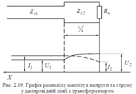 Якщо вибрати Для збільшення смуги пропускання використовують східчасті трансформатори. На рис. 2.16 наведений східчастий трансформатор між двопровідними лініями з різними хвильовими опорами. Смуга пропускання збільшується, а відбиття зменшується при збільшенні кількості сходинок та зменшенні їх величини. У граничному випадку при зменшенні величини сходинок при фіксованій величині Довжини сходинок можуть бути, як однаковими Експоненціальний хвильовий опір змінюється за законом