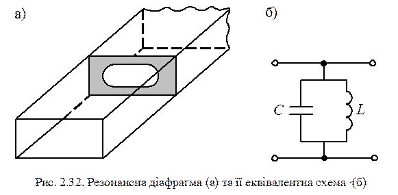 де Ро та Р − потужність на вході та виході фільтра відповідно. Найпростішим смуговим фільтром є резонансна діафрагма, яка складається з ємнісної та індуктивної діафрагми. Її еквівалентна схема являє собою паралельний коливальний контур (рис. 2.32).
