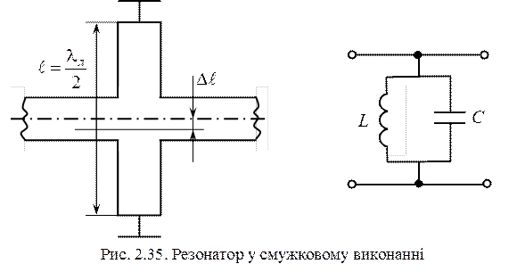 У сантиметровому діапазоні хвиль може бути більше 10000. На рис. 2.35 наведені технологія напівхвильового резонатора у смужковому виконанні та його еквівалентна схема. Якщо змістити центр резонатора, змінити величину