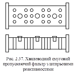 На рис. 2.37 наведений смуговий пропускаючий фільтр на хвилеводі з чвертьхвильовими зв’язками. Реактивна провідність створюється решіткою з трьох індуктивних штирів. Ємнісні гвинти, що розміщені у центрі кожного резонатора, призначені для резонансної експериментальної настройки фільтра.