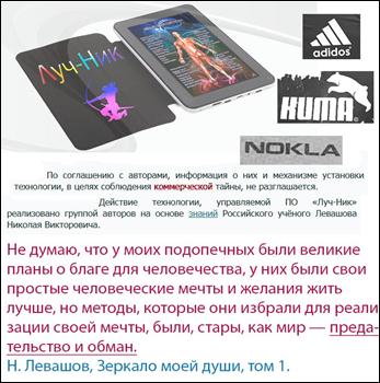 «Зазеркалье» было написано вовремя. САЙТ под «ПРИБОР» у них, уже был готов в сентябре 2013 года. «Программа так же была готова». Статья, на некоторое время, внесла «смятение» в ряды и «затормазила» «выпуск ИЗДЕЛИЯ». НЕКОТОРЫЕ «прозревшие», из «ПОМОЙКИ» ВСЕ же ушли, поняв, чем ВСЕ ЭТО МОЖЕТ ЗАКОНЧИТСЯ для них. Но остановиться Аншукова не захотела да и не могла. Она ВЫПОЛНЯЛА КОМАНДУ. КОМАНДУ «НА УНИЧТОЖЕНИЕ ТЕХНОЛОГИЙ Н. ЛЕВАШОВА». Эта команда «существует и сейчас». Но «не по зубам это действо ни АНШУКОВОЙ, ни ее КОМАНДИРАМ из небезысвестной организации, куда она так старательно ПИСАЛА ДОНОСЫ на Левашова, начиная с Архангельской эпопеи. Да и деньги нужны. Паралельно, она и с Владимиром Левашовым «договорилась о выпуске книг Н. В. Левашова (но пока это только в проекте который, на мой взгляд, НЕ СОСТОИТСЯ.). Встал вопрос – КАК НАЗВАТЬ, ТО, что «СОСТРЯПАНО» ИЗ УКРАДЕННОГО. ВСЁ ВЕДЬ УКРАЛИ - и ПРОГРАММУ и ИНСТРУКЦИЮ (но, не более – Мозга-то уже НЕТ). Инструкцию переделали (исковеркали) в силу СВОИХ «ЗНАНИЙ», «сравнив» их, свои «ЗНАНИЯ» со ЗНАНИЯМИ ЛЕВАШОВА. А вот с названием и ЗНАКОМ - украсть НЕ ПОЛУЧИЛОСЬ. Но не беда, ПРИДУМАЛИ - «ЛУЧ-НИК» и «изображение ЛИХОГО ЛУЧНИКА»! (Аншукова решила «НАЗВАТЬ», как «ЛУЧ НИКОЛАЯ», в сокращенном виде - «ЛУЧ-НИК»). Коментарий здесь обязателен, но позднее.