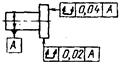 Сведения о предельных отклонениях формы и расположения указывают в прямоугольной рамке, разделенной на две или три части, в которых последовательно располагаются: условное обозначение отклонения, предельное отклонение или допуск в миллиметрах, буквенное обозначение базы или другой поверхности, относительно которой задается отклонение расположения. Если баз несколько, то в последнюю часть рамки вписывают все их обозначения (см. табл. 11, пример 10). Таблица 11