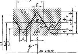Рис.49. Резьба метрическая. Профиль. ГОСТ 9150-81: d; D - наружный диаметр болта и гайки; d2; D2 - средний диаметр болта и гайки; d1; D1 - внутренний диаметр болта и гайки; Р - шаг резьбы; H - высота исходного треугольника; H1 - рабочая высота профиля; R - номинальный радиус закругления впадины болта Номинальный профиль является общим для болта и гайки, т.е. номинальные размеры параметров резьбы являются общими для наружной (болта) и для внутренней (гайки) резьб. Какие параметры резьбы называются основными? Основными параметрами резьбы являются: наружный диаметр резьбы d, D - диаметр воображаемого цилиндра, касательного к вершинам наружной резьбы или впадинам внутренней резьбы. Эти диаметры принимаются за номинальный диаметр резьбы; - средний диаметр резьбы d2, D2 - диаметр воображаемого соосного с резьбой цилиндра, образующая которого пересекает профиль витков в точках, где ширина выступа равна ширине канавки; - внутренний диаметр резьбы d1, D1 - диаметр воображаемого цилиндра, вписанного касательно к вершинам внутренней резьбы или впадинам наружной резьбы; - шаг резьбы Р - расстояние между соседними одноименными (правыми или левыми) боковыми сторонами профиля, измеренное в направлении, параллельном оси резьбы. Для многозаходных резьб введено понятие «ход резьбы» - величина относительного и осевого смещения винта (гайки} за один полный оборот. Ход резьбы равен Р · n = Рn, где Р - шаг резьбы; n - число заходов; Рn - ход резьбы. Диаметры средний и внутренний в зависимости от шага рассчитываются согласно формулам, приведенным в табл.21; угол профиля α - угол между боковыми сторонами профиля в осевой плоскости. Поскольку в метрической резьбе важна симметрия угла профиля, поэтому измеряют угол наклона боковой стороны профиля, т.е. половину угла профиля α/2 - угол между стороной профиля и перпендикуляром, опущенным из вершины профиля на ось резьбы; высота исходного треугольника Н - высота остроугольного профиля, полученного продолжением боковых сторон профиля до их пересечения; рабочая высота профиля H1 - высота соприкосновения сторон профиля наружной и внутренней резьб в направлении, перпендикуляр ном оси резьбы. Таблица 21 Расчет номинальных размеров среднего и внутреннего диаметров метрических резьб