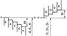Все отклонения и допуски отсчитывают от номинального профиля в направлении перпендикулярном оси резьбы. На схемах принято указывать половинные величины, полагая вторые половины расположенными на диаметрально противоположных профилях изделия. Положение полей допуска резьбы относительно элементов номинального профиля определяется основными отклонениями и обозначаются буквами латинского алфавита. Для наружных резьб предусмотрено пять верхних отклонений es, обозначаемых в порядке возрастания зазора буквами h, g, f, e, d, для внутренних резьб четыре нижних отклонений EI - H, G, F, Е (рис.50). Выбранная величина основного отклонения соблюдается единой по всему профилю, т.е. распространяется и на ненормируемые диаметры d1 или D.
