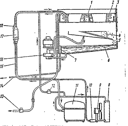 Рис. 3.74. Схема льодогенератора АСМ-120-6А: 1 – льодоформа; 2 – випарник; 3 – піддон випарника; 4 – колектор із форсунками; 5 – шторки; 6 – ванна; 7 – переливна трубка; 8 – конденсатор; 9 – вентилятор; 10 – осушувальний фільтр; 11 – компресор;