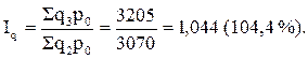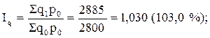 где iq – индивидуальный индекс физического объема (количества) товара; q1, q2, физический объем (количество) товара соответственно в отчетном и базисном периодах. Например, сельскохозяйственная организация продала следующее количество молока (поквартально): в I кв. –500 т, во 2-м – 600 т, в 3-м –700, в 4-м –450 т. Необходимо рассчитать индивидуальные индексы реализации молока за каждый последующий квартал по сравнению с первым кварталом: За 2 квартал: За 3 квартал: За 4 квартал: Следовательно, продажа молока в сельскохозяйственной организации во 2 и 3 кварталах шла с нарастанием, а в 4 квартале наблюдалось снижение. Целесообразно отметить, что рассмотренные в 11 главе базисные и цепные коэффициенты роста могут считаться индивидуальными индексами. Групповые индексы (субиндексы) характеризуют изменение отдельных, обычно однородных групп (частей) сложного явления. Так, например, индекс валовой продукции сельскохозяйственной организации в 2004 г. по сравнению с 2000 г. составил 150 %, а индексы продукции растениеводства – 138 %, продукции животноводства – 162 %. В этом примере индексы продукции растениеводства и животноводства выступают как групповые или субиндексы, входящие в общий индекс объема валовой продукции сельскохозяйственной организации. Групповые индексы имеют важное экономическое значение. Они помогают раскрыть закономерности в изменении структуры, в развитии отдельных частей изучаемого явления. Отметим, что групповые индексы по методике расчета аналогичны общим индексам. Общие индексы характеризуют изменение всей совокупности в целом. Общий индекс может быть исчислен двумя способами: первый заключается в том, что сначала отыскивают общие соизмерители (веса) для индексируемых величин отчетного и базисного периодов, рассчитывают произведения, которые суммируют, и затем исчисляют отношение этих двух сумм. При втором способе сначала исчисляют индивидуальные индексы, характеризующие изменение отдельных элементов сложного явления, а затем – среднюю величину изменений всех сопоставимых элементов. Общие индексы, исчисленные первым способом, называются агрегатными, а вторым – средними. Агрегатные и средние индексы более подробно рассматриваются ниже. В зависимости от базы сравнения различают базисные и цепные индексы. Необходимо обратить внимание на то, что базисные и цепные индексы, как индивидуальные, так и общие, могут быть рассчитаны только в том случае, если имеются данные не за 2, а за 3,4,5 и более периодов, или по 3,4,5 и более сравниваемым объектам. Индексы, исчисляемые путем сравнения данных поочередно каждого последующего с данными одного периода, принятого за базу сравнения, называются базисными индексами. Например, общими базисными индексами физического объема товаров являются следующие:
