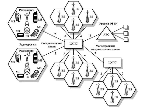 Технические основы построения систем мобильной связи. 8.1 Технические концепции построения СМС. Организация линий связи между абонентской станцией, базовой станцией и между базовыми станциями. Определение радиуса зоны уверенного приема. Модели радиосигналов с замираниями, обусловленными многолучевым распространением. Вероятностный характер распространения радиоволн в условиях города. Профессиональными системами мобильной или подвижной радиосвязи PMR (Professional Mobile Radio) называются телекоммуникационные системы, использующие в качестве каналов связи радиоканал и предусматривающие использование нестационарных (носимых) пользовательских терминалов. Как правило, они имеют радиальную или радиально-зоновую (сотовую) структуру сети и могут использовать как симплексные (односторонние), так и дуплексные каналы (двухсторонние) каналы связи. При этом предполагается, что сама система может использовать для своих служебных нужд и управления коммутируемые и выделенные проводные линии электросвязи и оборудование стационарных систем телефонной связи общего пользования - PSTN (англ. Public Switched Telephone Network). В связи с большим количеством различных по функциональному составу и назначению систем мобильной связи в международной трактовке для обобщенной классификации используется термин «система связи подвижной службы (ССПС)». Система связи подвижной службы общего пользования является двухуровневой составной телекоммуникационной сетью, включающей систему мобильной радиосвязи PMR (первый уровень) и телефонную сеть общего пользования - PSTN (второй уровень). Двухуровневая телекоммуникационная сеть обеспечивает функции коммутации и распределения информации в каждой из составных частей - рис. 8.1. Участки «1» составной сети являются радиолиниями, образованными между мобильными станциями (MS) и базовыми станциями (BS). Участки «2» сети представляют многоканальные соединительные линии между BS и центром коммутации подвижной службы (ЦКПС). Участки «3» сети являются магистральными соединительными линиями (МСЛ) между радиоуровнем и фиксированной сетью PSTN. Множество базовых станций, размещаемых по всей зоне обслуживания системы, позволяет обеспечивать устойчивую радиосвязь любого мобильного абонента радиоуровня, в какой бы точке зоны обслуживания он не находился, с другим мобильным абонентом или с абонентом фиксированной сети PSTN через ЦКПС. Таким образом, ЦКПС выполняет роль автоматического радиокросса, обеспечивающего коммутацию между собой различных мобильных станций в зоне обслуживания, коммутацию MS с абонентскими телефонными аппаратами сети, а также выход на ЦКПС других зон обслуживания. Увеличение плотности размещения базовых станций BS в зоне обслуживания позволяет сократить протяженность линий мобильной радиосвязи между MS и BS. Это, однако, не гарантирует предоставление и получение высококачественной радиосвязи в течение длительного времени из-за экранирования антенн MS и BS при работе в движении, особенно в условиях сильнопересеченной местности и воздействия помех. Участки «1» составной сети (первичный пучок линий) могут рассматриваться как линии с кратковременным занятием. Такие линии в процессе установления связи могут вести себя как исправные, но из-за переходов в состояния плохого качества они не могут использоваться для даль