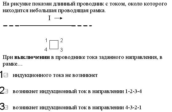 1) индукционного тока не возникнет; 2) возникнет индукционный ток в направлении 1-2-3-4; 3) возникнет индукционный ток в направлении 4-3-2-1. Решение Вокруг проводника с током существует магнитное поле, направление которого определяется правилом правого винта (или буравчика). Согласно этому правилу, нужно мысленно закручивать буравчик по направлению тока, тогда рукоятка буравчика будет вращаться, описывая окружность, по касательной к которой направлен вектор магнитной индукции. В нашем примере вектор магнитной индукции, пронизывающий рамку, направлен за чертёж. При выключении тока в проводнике в замкнутом контуре возникает индукционный ток, который, согласно закону Фарадея – Ленца, создает магнитное поле, препятствующее изменению магнитного потока. Поэтому магнитное поле индукционного тока тоже должно быть направлено за чертёж, чтобы препятствовать уменьшению тока. Направление индукционного тока также можно определить по правилу правого винта (буравчика), т.е. поступательное движение буравчика должно совпадать с направлением вектора магнитной индукции, созданной индукционным током. Тогда рукоятка буравчика будет двигаться в направлении индукционного тока в рамке. Поэтому в нашем примере индукционный ток возникнет в направлении 1–2–3–4. Ответ: вариант 2.