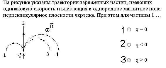 Варианты ответов: 1) q = 0; 2) q < 0; 3) q > 0. Решение На заряд, движущийся в магнитном поле, действует сила Лоренца, направление которой, если движется положительный заряд, определяется по правилу левой руки. Согласно этому правилу, вектор магнитной индукции Ответ: вариант 2. .