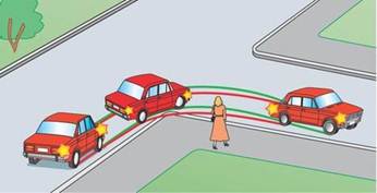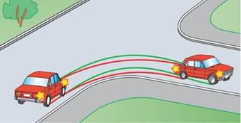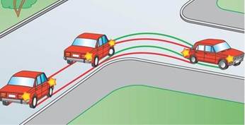 Рис. 2. Задние колеса проходят ближе к центру поворота На последнем рисунке (рис. 3 г) изображен вариант поворота, который позволяет уберечь колеса автомобиля от повреждения о бордюрный камень и избежать наезда на ноги пешеходов, стоящих на углу тротуара. Чтобы выполнить такой поворот сначала надо прижаться к левому краю проезжей части и уже из этого положения начинать поворот направо. Однако с точки зрения общей безопасности движения такой маневр допустим лишь при выезде из двора и только в узких "угловатых" местах без интенсивного движения.