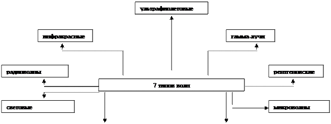 IV. Find the information explaining why we call light a visible ray. Read the information to your partner. V. 1) Answer the questions on paragraph 3: 1. What rays do we deal with when we listen to a radio programme? 2. How are infrared rays referred to sometimes? 3. What rays do we use when we sit under a sun-tan lamp? 4. What kind of rays can we find inside the hospital? 5. Are microwaves used with radar equipment? 2) Name the types of invisible rays we find in use: a) in our homes-, b) outside the home. VI. In paragraph 4 find the English equivalents to the following words: луч, тип, частота, расстояние, напоминать, длина волны, период, полный (законченный), двигаться, называть, длинный, низкий, количество. VII. Speak about the electromagnetic waves using English words from the logical diagram. VIII. Fill in the boxes of the following logical diagram with English equivalents. IX. Say briefly what each paragraph is about.