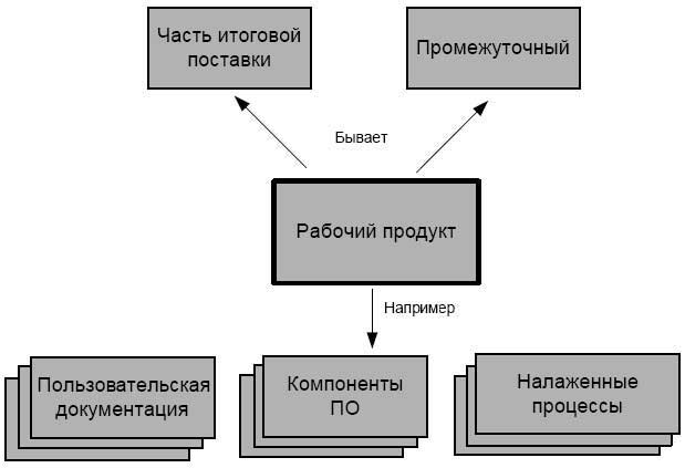 Рис. 3.1. Ключевая разница между рабочим продуктом и компонентой ПО заключается в том, что первый необязательно материален и осязаем (not to be engineered), хотя может быть таковым. Нематериальный рабочий продукт – это, как правило, некоторый налаженный процесс – промышленный процесс производства какой-либо продукции, учебный процесс в университете (на факультете, на кафедре) и т.д. Важно отметить, что рабочий продукт совсем не обязательно является составной частью итоговой поставки. Например, налаженный процесс тестирования системы не поставляется заказчику вместе с самой системой. Умение управлять проектами (не только в области программирования) во многом связано с искусством определять нужные рабочие продукты, настаивать на их создании и в их терминах вести приемку промежуточных этапов работы, организовывать синхронизацию различных рабочих групп и отдельных специалистов. Многие методологии включают в себя описание специфичных рабочих продуктов, используемых в процессе – CMMI, MSF, RUP и др. Например, в MSF это программный код, диаграммы приложений и классов (application diagrams и class diagrams), план итераций (iteration plan), модульный тест (unit test) и др. Для каждого из них точно описано содержание, ответственные за разработку, место в процессе и др. аспекты. Остановимся чуть детальнее на промежуточных рабочих продуктах. Компонента ПО, созданная в проекте одним разработчиком и предоставленная для использования другому разработчику, оказывается рабочим продуктом. Ее надо минимально протестрировать, поправить имена интерфейсных классов и методов, быть может, убрать лишнее, не имеющее отношение к функциональности данной компоненты, разделить public и private, и т.д. То есть проделать некоторую дополнительную работу, которую, быть может, разработчик и не стал делать, если бы продолжал использовать компоненту только сам. Объем этих дополнительных работ существенно возрастает, если компонента должна быть представлена для использования в разработке, например, в другой центр разработки (например, иностранным партнерам, что является частой ситуацией в оффшорной разработке). Итак, изготовление хороших промежуточных рабочих продуктов очень важно для успешности проекта, но требует дополнительной работы от их авторов. Работать одному, не предоставляя рабочих продуктов – легче и для многих предпочтительнее. Но работа в команде требует накладных издержек, в том числе и в виде трат на создание промежуточных рабочих продуктов. Конечно, качество этих продуктов и трудозатраты на их изготовление сильно варьируются в зависимости от ситуации, но тут важно понимать сам принцип. Итак, подытожим, что промежуточный рабочий продукт должен обязательно иметь ясную цель и конкретных пользователей, чтобы минимизировать накладные расходы на его создание.