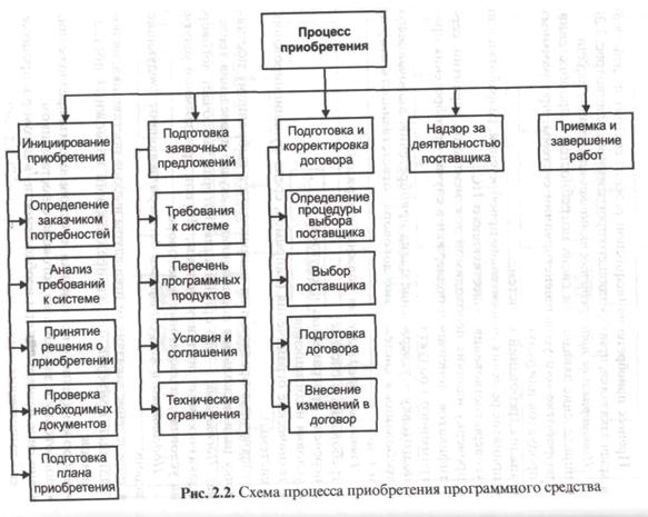 ПРИНЦИПЫ РАЗРАБОТКИ ПО. Процесс приобретения (acquisition process) состоит из действий и задач заказчика, приобретающего программное средство (рис. 2.2). Инициирование приобретениявключает следующие задачи: • определение заказчиком своих потребностей в приобретении, разработке или усовершенствовании системы, программных • анализ требований к системе; • принятие решения относительно приобретения, разработки или усовершенствования существующего ПС; • проверку наличия необходимой документации, гарантий, сертификатов, лицензий и поддержки в случае приобретения программного продукта; • подготовку и утверждение плана приобретения, включающего требования к системе, тип договора, ответственность сторон и т. д. Заявочные предложениядолжны содержать: • требования к системе; • перечень программных продуктов; • условия и соглашения; • технические ограничения (например, среда функционирования Заявочные предложения направляются выбранному поставщику (или нескольким поставщикам в случае проведения тендера). Поставщик — это организация, которая заключает договор с заказчиком на поставку системы, ПС или программной услуги на условиях, оговоренных в договоре.