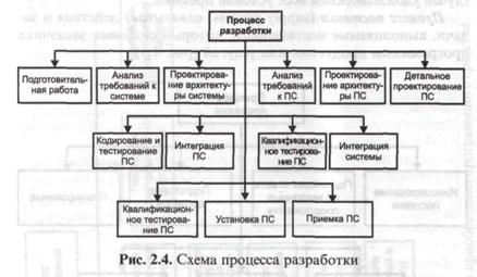 Инициирование поставки заключается в рассмотрении поставщиком заявочных предложений и принятии решения о согласии с выставленными требованиями и условиями или предложение своих. Планирование включает следующие задачи: • принятие решения поставщиком относительно выполнения • разработку поставщиком плана управления проектом, содер Процесс разработки (development process) предусматривает действия и задачи, выполняемые разработчиком, и охватывает работы по созданию ПС и его компонентов в соответствии с за данными требованиями, включая оформление проектной и эксплуатационной документации; подготовку материалов, необходимых для проверки работоспособности и соответствующего качества программных продуктов, материалов, необходимых для организации обучения персонала, и т. д. (рис. 2.4).
