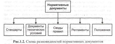 Стандартизация ПО. В процессе стандартизации вырабатываются нормы, правила, требования, характеристики, касающиеся объекта стандартизации, которые оформляются в виде нормативного документа. Рассмотрим разновидности нормативных документов, которые рекомендуются руководством 2-й Международной организации по стандартизации и Международной электротехнической комиссии (ИСО/МЭК), а также принятые в государственной системе стандартизации Российской Федерации (РФ). Руководство ИСО/МЭК рекомендует: стандарты, документы технических условий, своды правил, регламенты (технические регламенты), положения (рис. 1.2).
