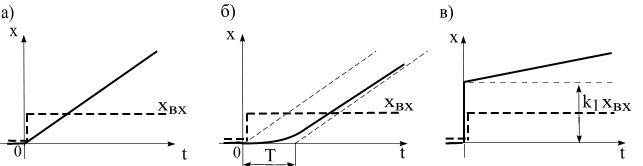 График переходной характеристики приведен на рис. 4.7,а. Интегрирующее звено с замедлением. Звено описывается дифференциальным уравнением