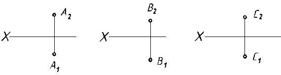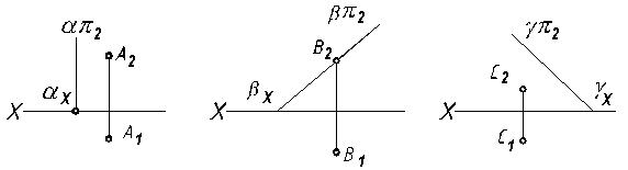 1. Дать определение плоскостям общего положения, проецирующим и уровня. 2. Характерный признак расположения проекций или следов плоскостей общего положения, проецирующих и уровня. 3. Каковы условия принадлежности прямой линии и точки данной плоскости? Свойства вырожденных проекций плоскостей. 4. Как провести на эпюре через заданную прямую проецирующую плоскость и плоскость общего положения? 5. Как провести на эпюре через данную точку проецирующую плоскость и плоскость общего положения? Задача 27. Через заданные точки провести следующие плоскости: проецирующую проецирующую положения