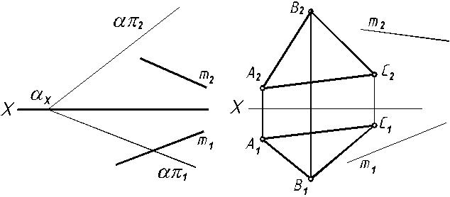 Плоскости задать пересекающимися прямыми (а) и следами (б).