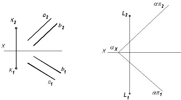Задача 33. Даны плоскости α иβ (а ║ b) и точки K и L. Построить плоскости, проходящие через заданные точки параллельно заданным плоскостям.