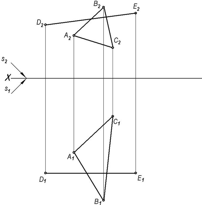 Задача 93. Построить тень от точки и прямой на плоскости методом лучевых сечений.