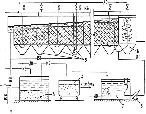 Анализ работы наземных очистных сооружений шахтных вод показывает, что этим технологиям присущи следующие недостатки: а) сложность технологических схем и конструктивных решений очистных сооружений; б) необходимость использования в процессах очистки в больших количествах дефицитных и дорогих химических реагентов; кварцевого песка; сорбентов и других материалов (при этом реагенты сами являются загрязнителями вод); в) высокая стоимость очистных сооружений (от 6 до 15% основных фондов); г) отсутствие простых и надежных решений по чистке емкостей и аппаратов от осадков; д) возврат под землю очищенной воды для подземных технологических нужд; е) отторжение значительных земельных площадей под очистные сооружения. Чтобы снизить расходы на строительство очистных сооружений, уменьшить земельные отводы под строительные площадки и повысить эффективность работы сооружений необходимо стремиться к недопущению избыточного загрязнения шахтных вод и осветлению их во всех звеньях канализирования от действующих очистных и подготовительных забоев к поверхности. С этих позиций целесообразным является перенос операций по осветлению шахтных вод с поверхности в подземные условия. Применение подземной очистки шахтных вод создает условия для работы оборудования шахтного водоотлива на очищенной воде, и использовать водосборник как ее аккумулятор, при этом обеспечиваются нормальные условия ведения горных процессов по добыче угля, и повышается безопасность шахт. Очищенную воду можно использовать для пылеподавления и пожаротушения. Существующие технологии подземной очистки шахтных вод, как правило, не обеспечивают требуемой степени осветления. Предлагается следующая современная технологическая схема очистки шахтных вод от взвешенных веществ под землей (см. рис. 18).