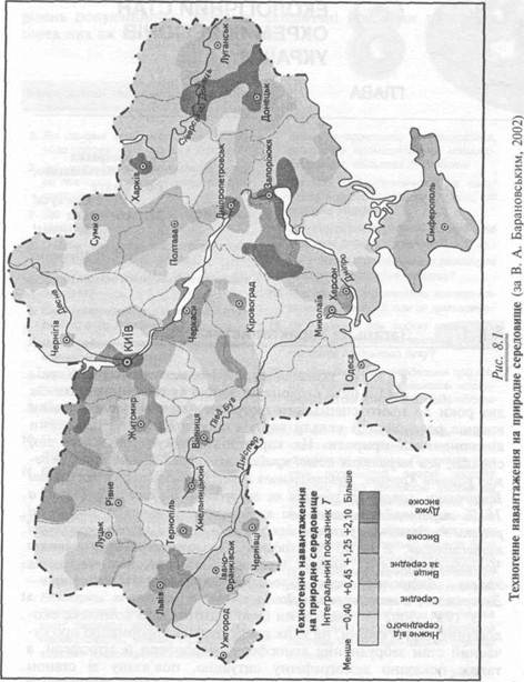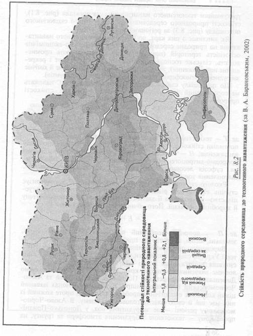 урахуванням техногенного навантаження на довкілля (рис. 8.1), стійкості природного середовища (рис. 8.2) і його екологічного потенціалу (рис. 8.3) за регіонами України. Як випливає з цих карт, до показника техногенного навантаження на природне середовище Т входять: соціально-економічна освоєність територій (показники, що характеризують промисловість, сільське господарство, будівництво, транспорт і рекреаційне навантаження); забрудненість довкілля (радіаційне й хімічне забруднення атмосферного повітря, природних вод і ґрунтів). До потенціалу стійкості природного середовища С належать метеорологічний потенціал атмосфери, потенціали стійкості природних вод, ґрунтів і біотичний потенціал. Екологічний потенціал територій Е обчислено за формулою де f — техногенне навантаження на природне середовище; С — потенціал стійкості природного середовища до техногенного навантаження; Н — ступінь ураженості територій несприятливими природно-антропогенними процесами (зсуви, ерозія, заболочення, суфозія лесових порід, дефляція, карст, селі, засолення, підтоплення тощо). Еколого-економічний потенціал територій К характеризує ступінь екологічної рівноваги в інтегрованій геосистемі «суспільство—природа» та її здатність виконувати антропоекологічну й виробничу функції. Його обчислюють за формулою К=Е+ П, де П — природно-ресурсний потенціал (мінеральні, водні, земельні, лісові, фауністичні, природно-рекреаційні ресурси). Вирішення проблеми поліпшення екологічного стану території України слід розпочинати насамперед із тих регіонів, у яких ситуація напруженіша й які мають найбільше соціально-екологічне значення для нашої країни. Такими регіонами визнано Донецько-Придніпровський, Поліський, Карпатський та Азово-Чорноморський із річкою Дніпро. В усіх цих регіонах наявний цілий комплекс екологічних проблем (табл. 8.1), проте кожний із них має ще й свою власну головну проблему. В Азово-Чорно-морському регіоні — це забруднення вод, у Донецько-Придніпровському — техногенне забруднення атмосфери та ґрунту, на 361
