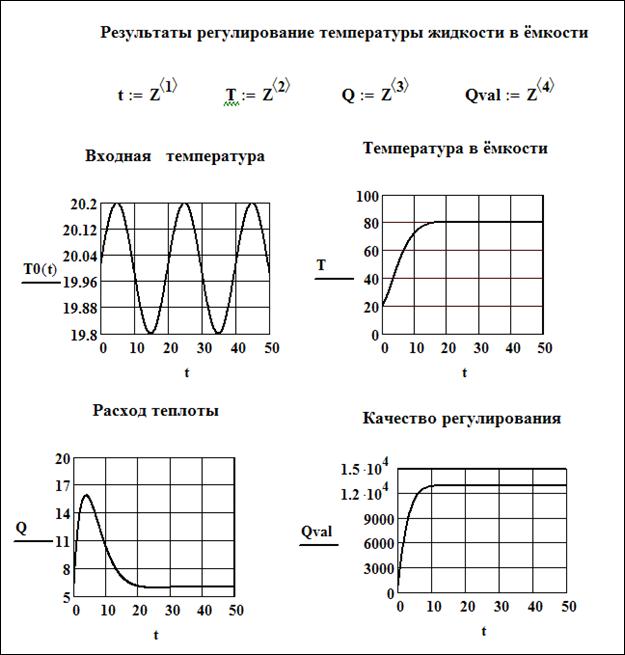 Рисунок 2.2 –Моделирование процесса управления температурой жидкости в емкости (задание исходных данных и интегрирование системы уравнений)