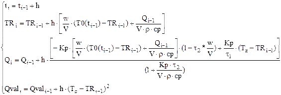 На втором этапе рассмотрим задачу об определении оптимальных настроек ПИД- регулятора: коэффициент пропорциональности –Kp, время изодрома- Для интегрирования системы дифференциальных уравнений на каждом шаге решения оптимальной задачи воспользуемся методом Эйлера. В соответствие с этим методом система дифференциальных уравнений сводится к решению системы рекуррентных соотношений: